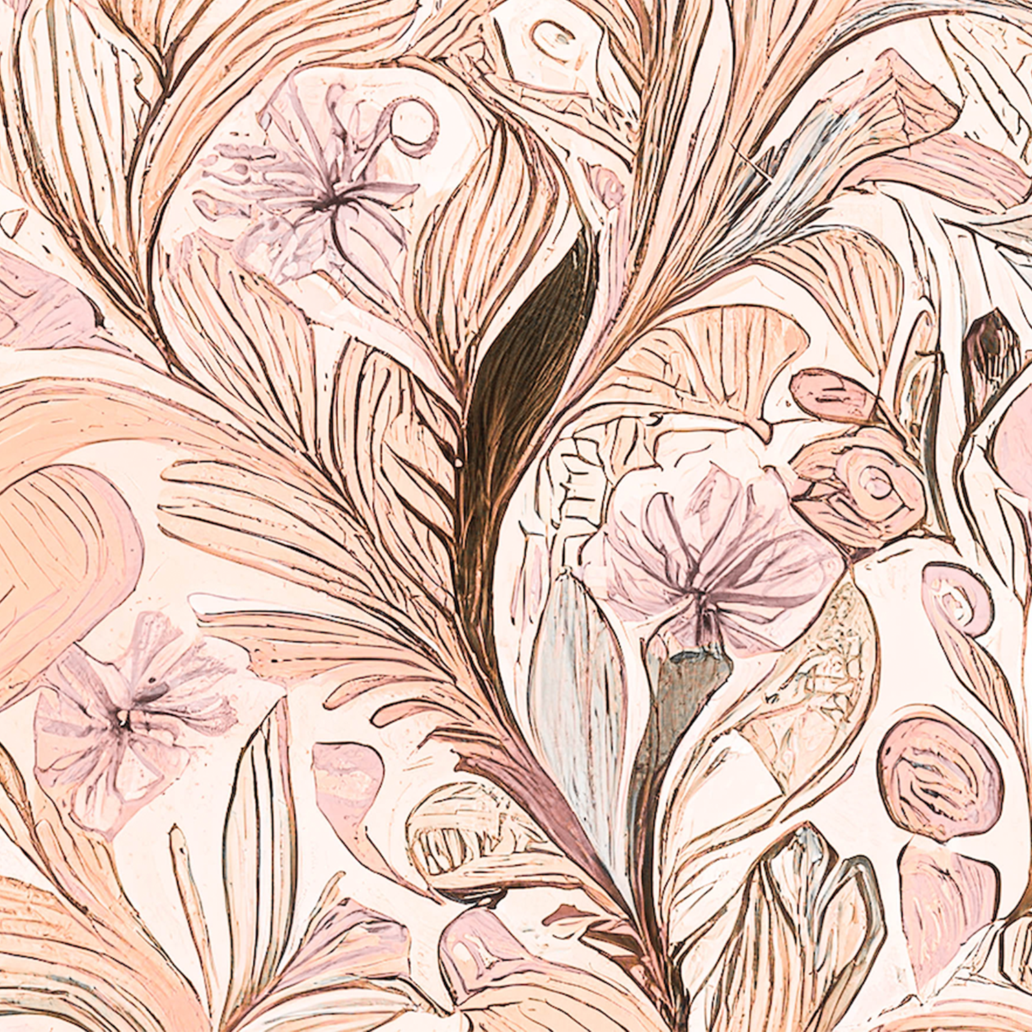 L' Été is a soft and feminine abstract print that captures the essence of summertime. It features scrolls, swirls, feathers, flowers and leaves, all delicately woven together to create a fanciful, flowing and romantic design. The print also has a hidden heart, adding a touch of intrigue and playfulness.