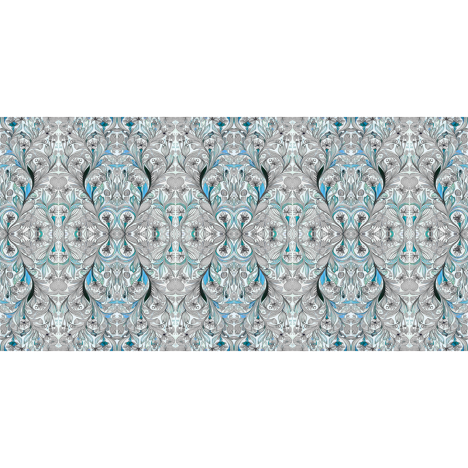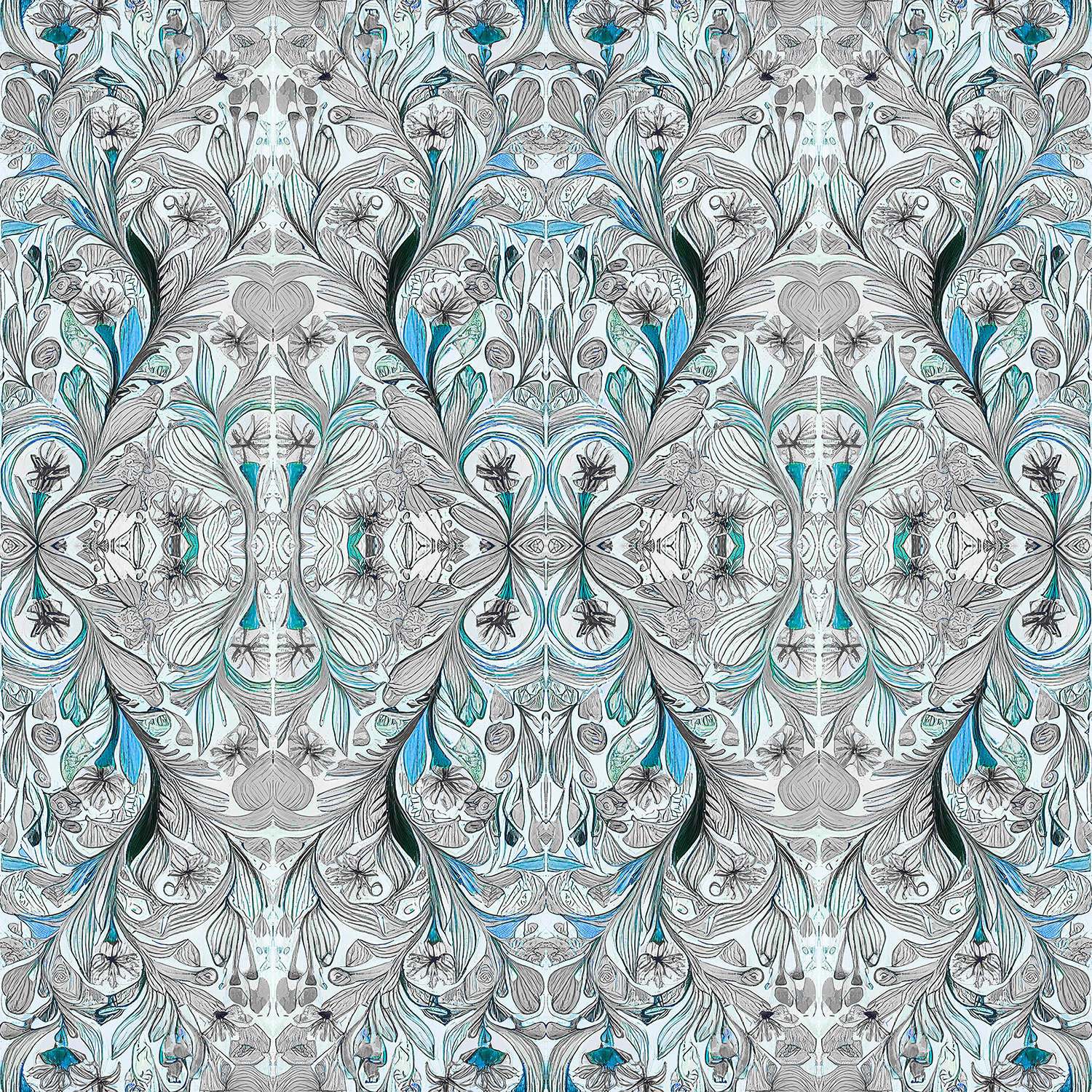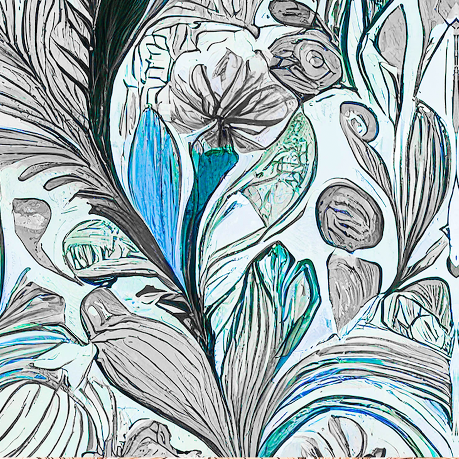 L' Été is a soft and feminine abstract print that captures the essence of summertime. It features scrolls, swirls, feathers, flowers and leaves, all delicately woven together to create a fanciful, flowing and romantic design. The print also has a hidden heart, adding a touch of intrigue and playfulness.