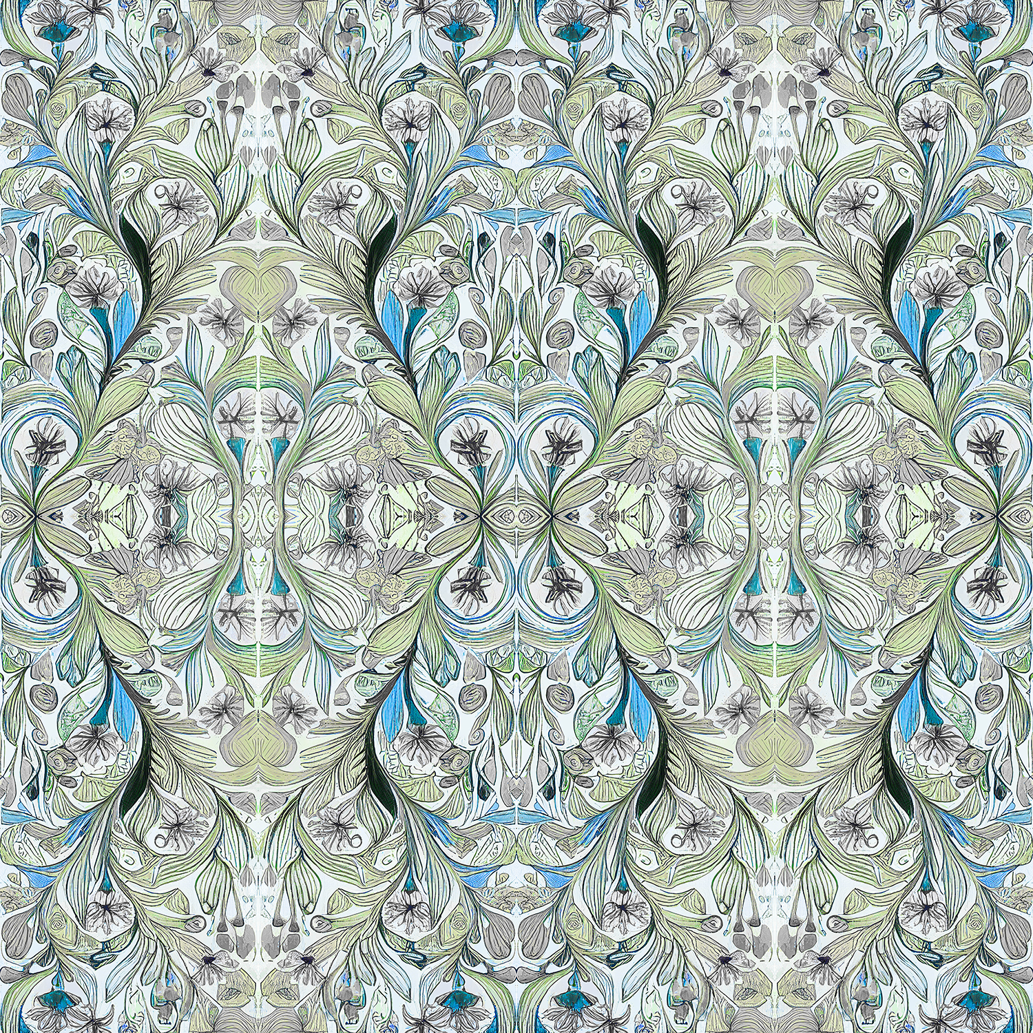 L' Été is a soft and feminine abstract print that captures the essence of summertime. It features scrolls, swirls, feathers, flowers and leaves, all delicately woven together to create a fanciful, flowing and romantic design. The print also has a hidden heart, adding a touch of intrigue and playfulness.