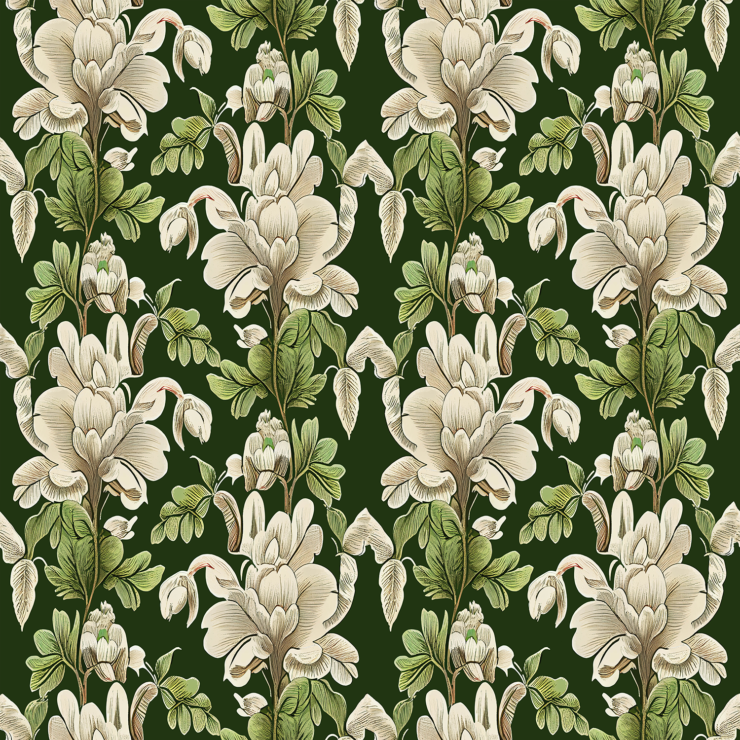 Magnolia Gardens Green pre-pasted removable wallpaper is handmade to order by artisans right here in the US. Our bespoke wallpapers typically ship within 7-10 business days (this includes samples).